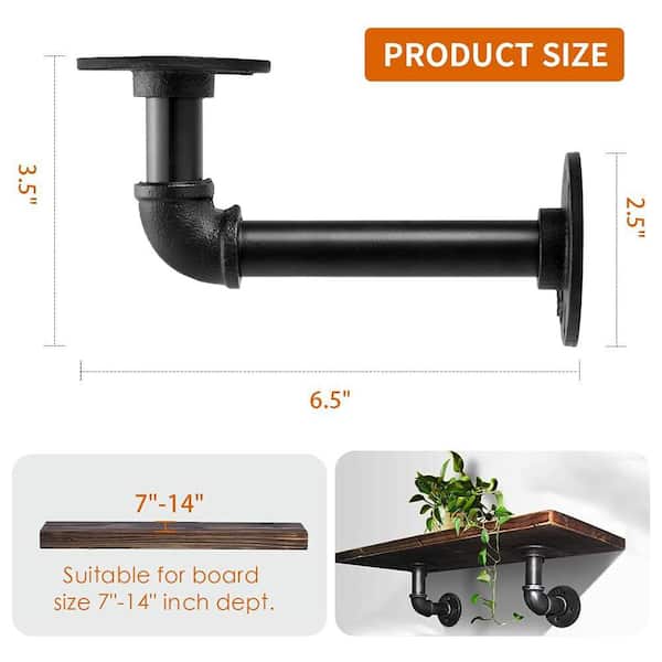Industrial Pipe Shelf Brackets for 7-14 Boards Heavy Duty Iron L Pipe Floating Shelves Black 6 Pack