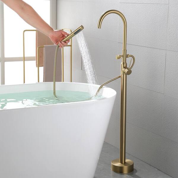 Eli 1-Handle Freestanding Floor Mount Tub Gooseneck Faucet with Swivel Hand Shower in Brushed Gold