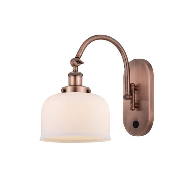 Bell 1-Light Antique Copper, Matte White Wall Sconce with White Glass Shade