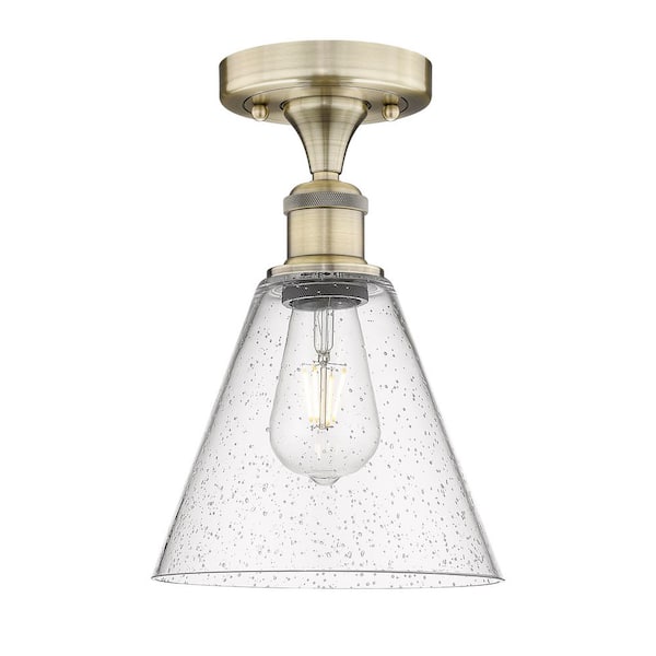 Berkshire 8 in. 1-Light Antique Brass Industrial Semi-Flush Mount with Seeded Glass Shade