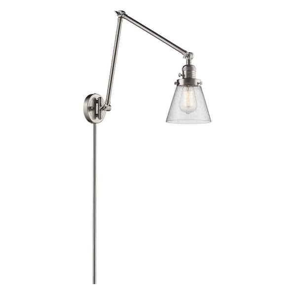 Cone 1-Light Brushed Satin Nickel, Seedy Hardwired Swing Arm Wall Lamp with Glass Shade and 84 in. Cord