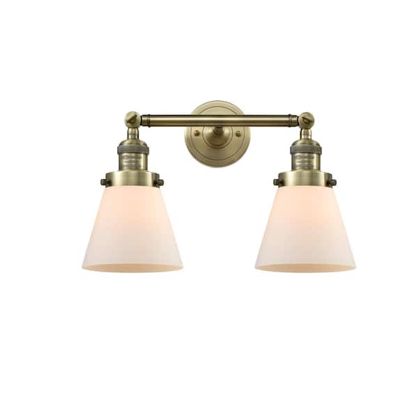 Cone 16 in. 2 Light Matte White, Antique Brass Vanity Light with White Glass Shade