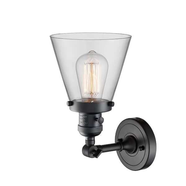 Cone 6.25 in. 1-Light Matte Black Wall Sconce with Clear Glass Shade with On/Off Turn Switch