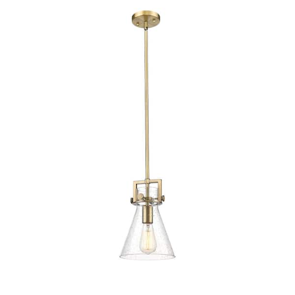 Newton Cone 100-Watt 1 Light Brushed Brass Shaded Pendant Light with Seeded glass Seeded Glass Shade