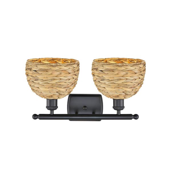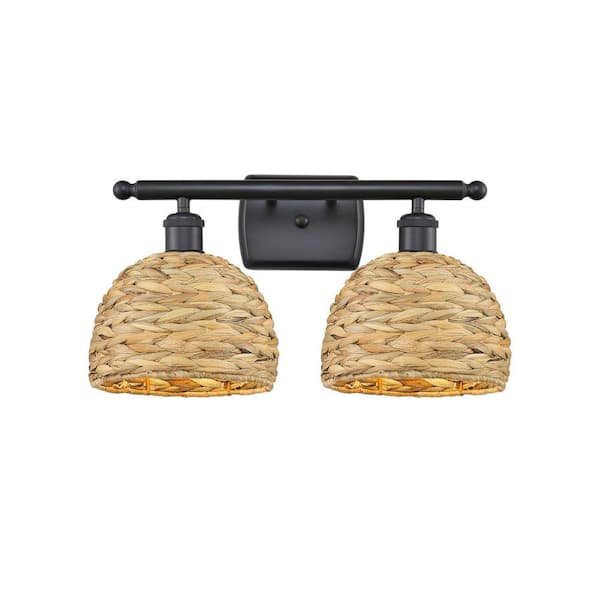 Woven Rattan 18 in. 2-Light Matte Black Vanity Light with Rattan Shade