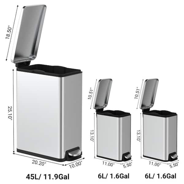 11.9 Gal. and Two 1.6 Gal. Slim Step-On Metal Household Trash Can Set for Kitchen, Office, Bathroom, Stainless Steel