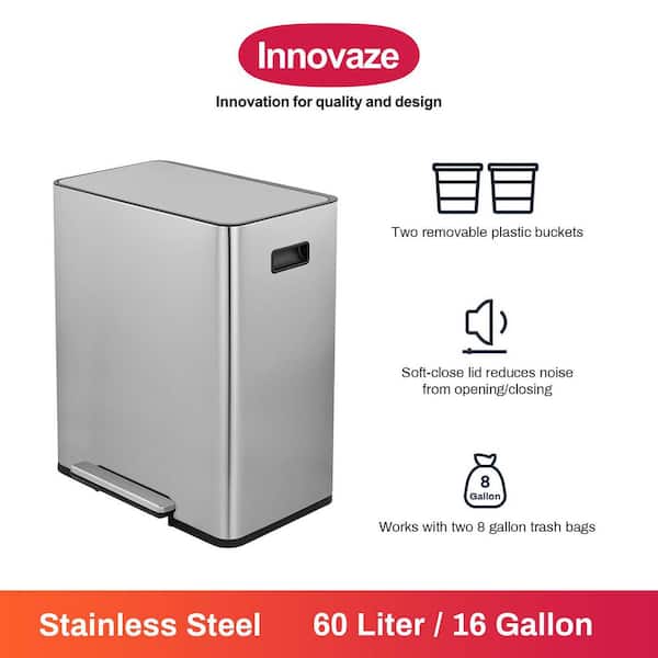 16 gal. Stainless Steel Step-on Indoor Recycling Bin with Dual 8 gal. + 8 gal. Compartments for Kitchen, Silver