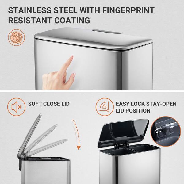 9.5 Gal. Trash Can, 4.75 Gal. Dual Compartment Recycling Step-On Kitchen Trash Can, Stainless Steel