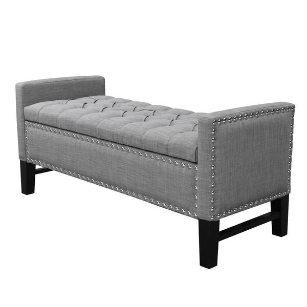 Emmaline Light Grey Linen Storage Bench Button Tufted Nailhead Trim