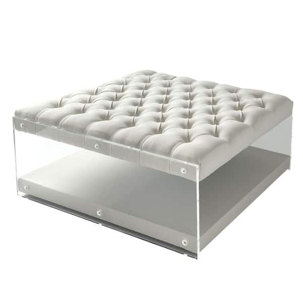 Fleur Cream White Linen Ottoman Cocktail Table with Button Tufted Clear Acrylic Sides