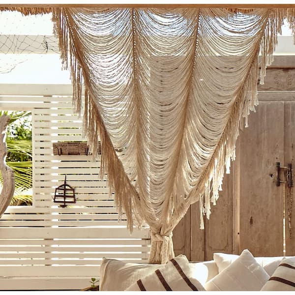 Ivory Cotton Macrame Curtain-59 in. x 75 in., Boho Doorway/Window/Wall Decor & Headboard Accent