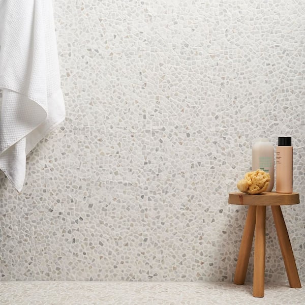 • Natural marble mosaic tile with a warm neutral color palette