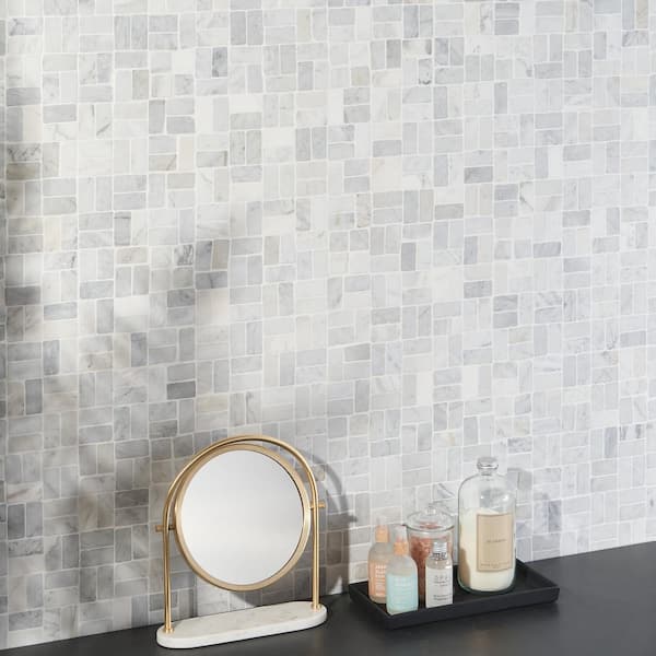 Countryside Interlocking Carrara 4 in. x 0.31 in. Natural Marble Floor and Wall Mosaic Tile Sample