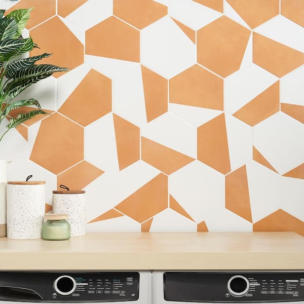 Porcelain hexagon tiles feature a matte-finish encaustic look