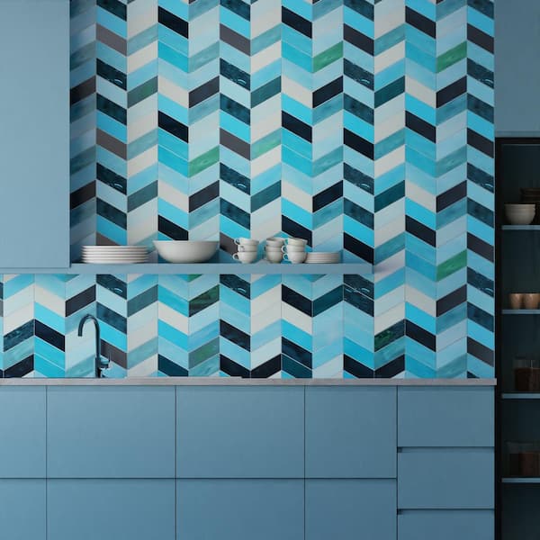 • Multi-colored chevron glossy glass mosaic tile in bold colorways