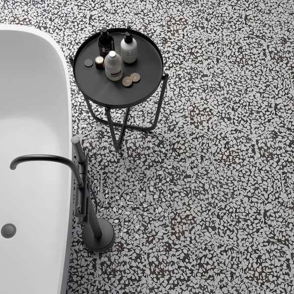 Features a terrazzo look on a geometric tile available in 7 color