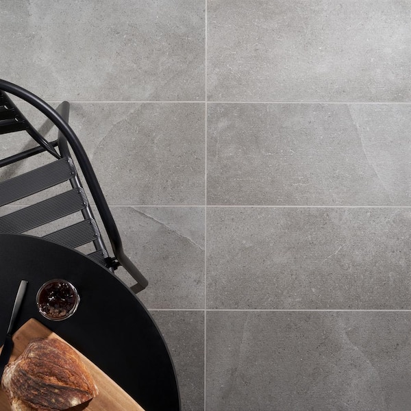Large format chiseled limestone look matte porcelain tile