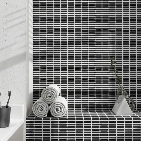 Nova Black 11.88 in. x 0.23 in. Mini Brick Frosted Glass Mosaic Floor and Wall Tile (0.96 sq. ft./ Each)