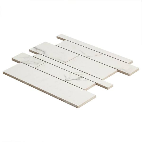 Saroshi Statuario Venato 4 in. x 0.33 in. Matte Porcelain Marble Look Floor and Wall Mosaic Tile Sample
