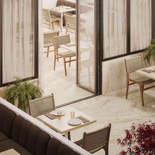 • Stone look hexagon matte porcelain tile w/ rich veining & texture