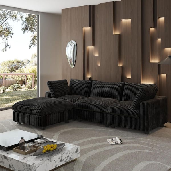 118.11 in. Rabbit Plush Fabric Square Arm 4-Piece L Shaped Modular Sectional Sofa in Black with Ottoman