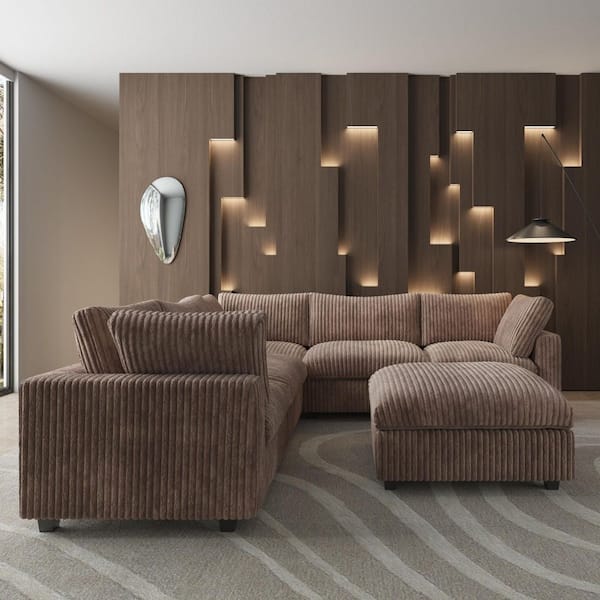 118 in. Rabbit Plush Fabric Square Arm 6-Piece Modular Free Combination Sectional Sofa in. Brown
