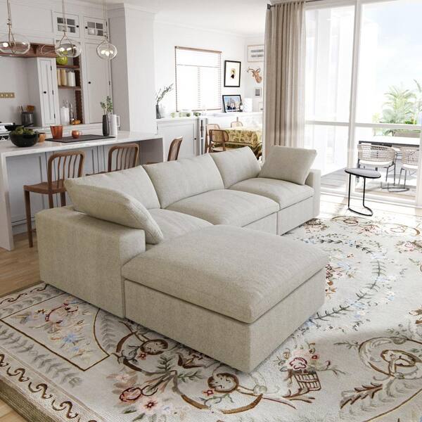 120.3 in. Square Arm Linen L Shaped Free Combination Modular 3-Seater Sectional Sofa with Ottoman in. Light Brown
