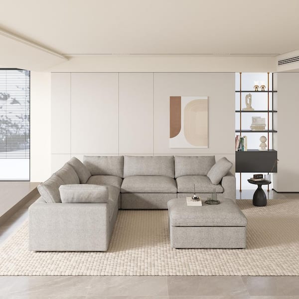 120.45 in. W Square Arm Linen 6-Piece Modular Free Combination Sofa with Storage Ottoman in Gray