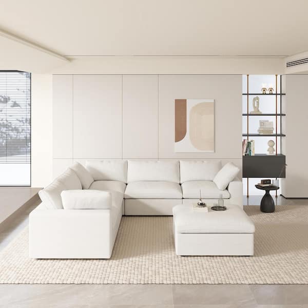120.45 in. W Square Arm Linen 6-Piece Modular Free Combination Sofa with Storage Ottoman in White