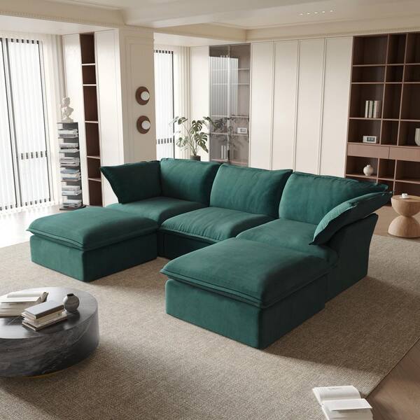 122.8 in. Flared Arm 5-Piece Linen Down-Filled Deep Seat Modular Free Combination Sectional Sofa with Ottoman in. Green