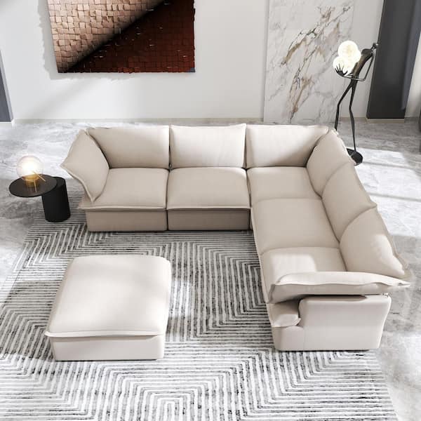 122.8 in. Flared Arm L Shaped linen 7-Seat Deep Seat 6-piece Sectional Sofa Beige for Living Room and Spacious Space