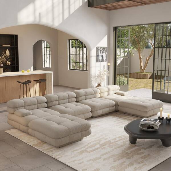 146.4 in. Square Arm Teddy Velvet 6-piece Deep Seat Modular Sectional Sofa with Movable Ottoman in. Brown