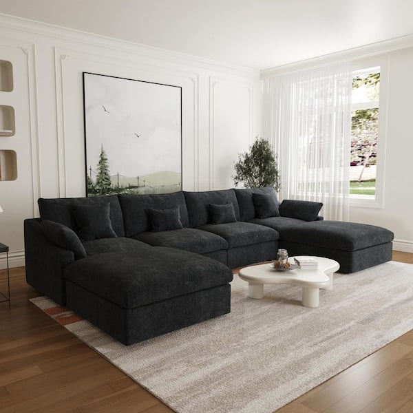 155.9 in. Slope Arm 6-Piece U-Shaped Linen Modern Oversize Modular Sectional Sofa Couch in Black with Ottoman