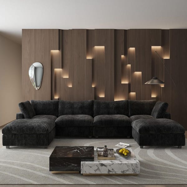 157.48 in. Square Arm 6-Piece Rabbit Velvet Plush Modular Free Combination Sectional Sofa with Ottoman in Black