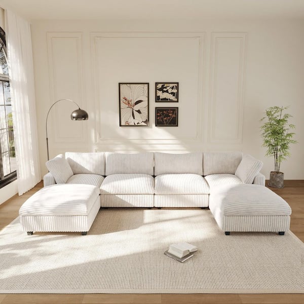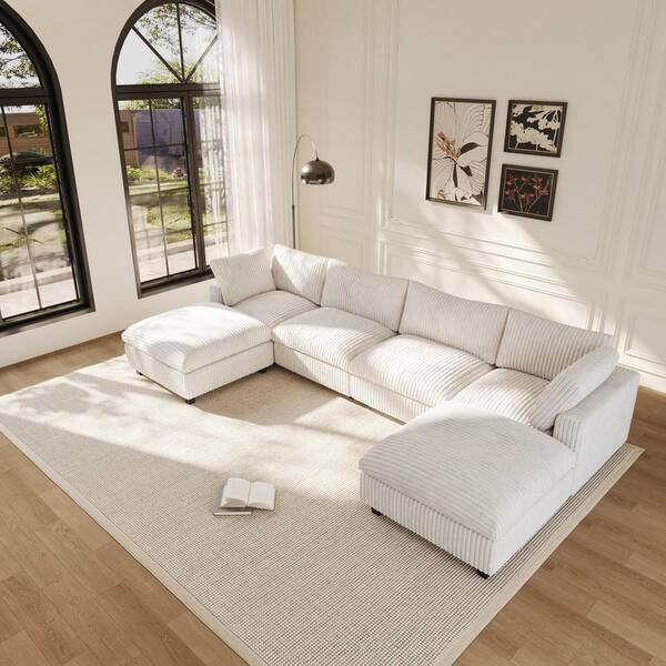 157.48 in. W Square Arm Faux Rabbit Plush Fabric U Shaped Free Combination Sofa in Beige with Removable Ottoman