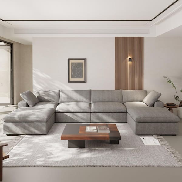 160.5 in. Square Arm Linen 6-Piece U Shaped Free Combination Modular Sectional Sofa with Ottomans in. Gray