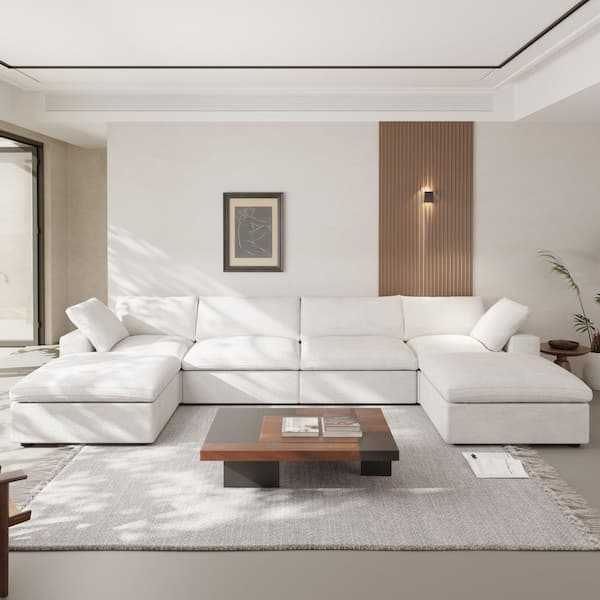 160.5 in. Square Arm Linen 6-Piece U Shaped Free Combination Modular Sectional Sofa with Ottomans in. White