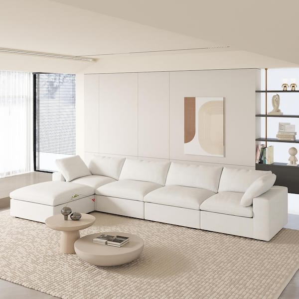 160.6 in. W Square Arm Linen L-Shaped 5-Pieces Modular Free Combination Sofa with Storage Ottoman in White