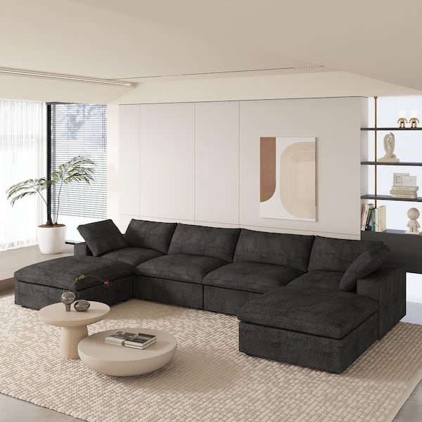 160.6 in. W Square Arm Linen U-Shaped 6-Pieces Modular Free Combination Sofa with Storage Ottoman in Black