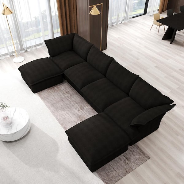 162.98 in. Flared Arm 6-Piece linen U Shaped Sectional Sofa in Black with Storage Ottoman