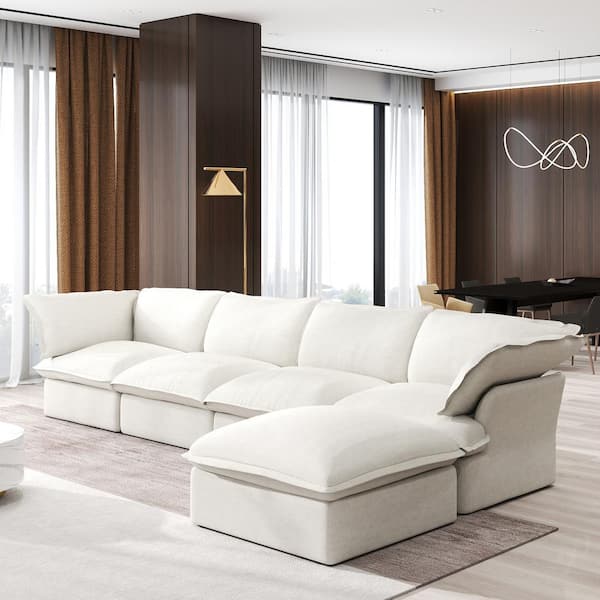 162.98 in. Wide Flared Arm 5-Piece Linen L Shaped Sectional Sofa in White with Storage Ottoman