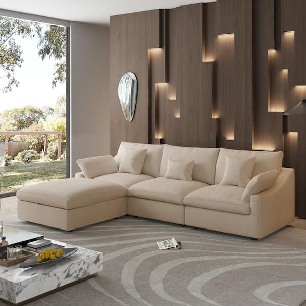 4-Piece Linen L Shaped Sectional Sofa Living Room Set Modular Free Combination Couch Brown with Storage Ottoman