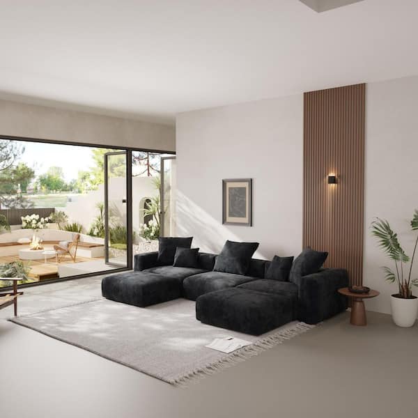 5-Piece Black 141 in. Corduroy Velvet U-Shaped Sectional Sofa with Ottoman and Removable Covers Living Room Set