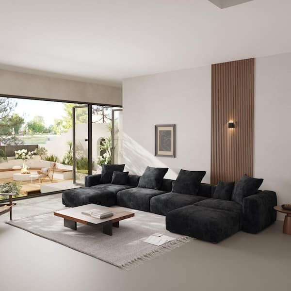 6-Piece Black 181 in. Corduroy Velvet U-Shaped Sectional Sofa with Ottoman and Removable Covers Living Room Set