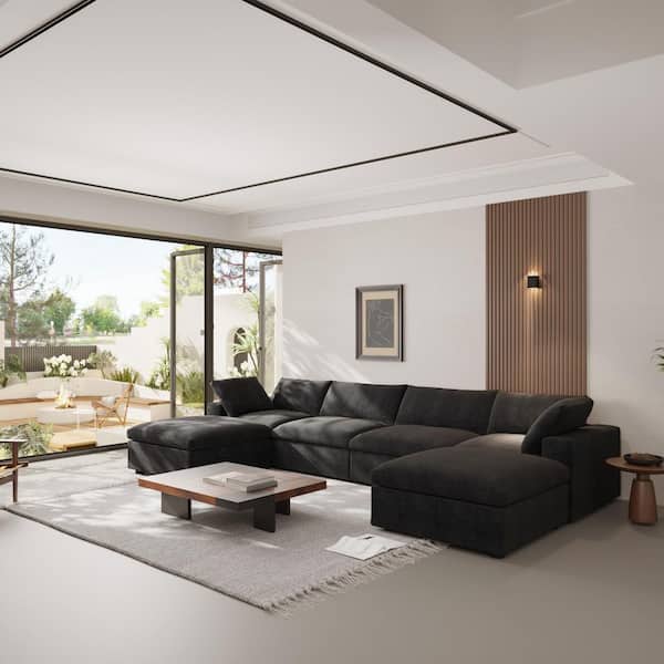 6-Piece Black Linen U Shaped Sectional Sofa Living Room Set with Removable Covers and Ottoman