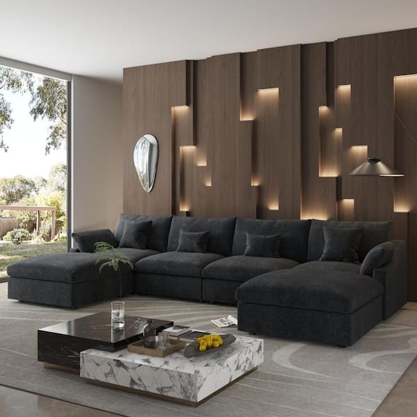 6-Piece Sectional Sofa 155.9 in. Linen Modular Free Combinable Deep Seat Couch with Ottoman Living Room Set in Black