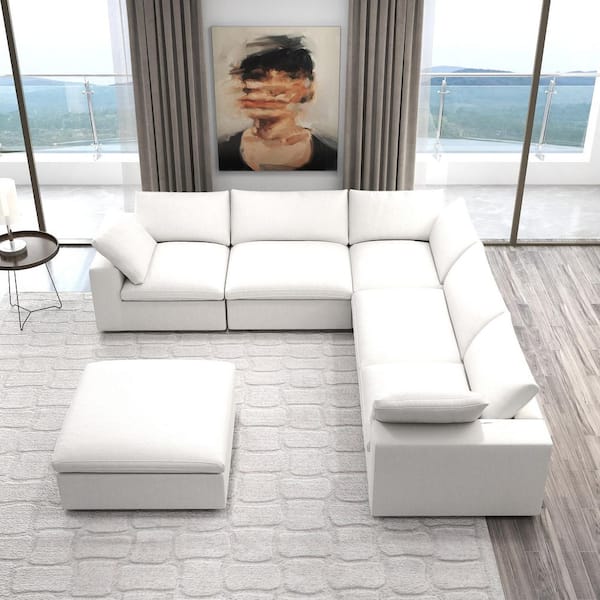 6-Piece White Linen Modular Free Combination Sectional Sofa Living Room Set with Removable Covers and Ottoman
