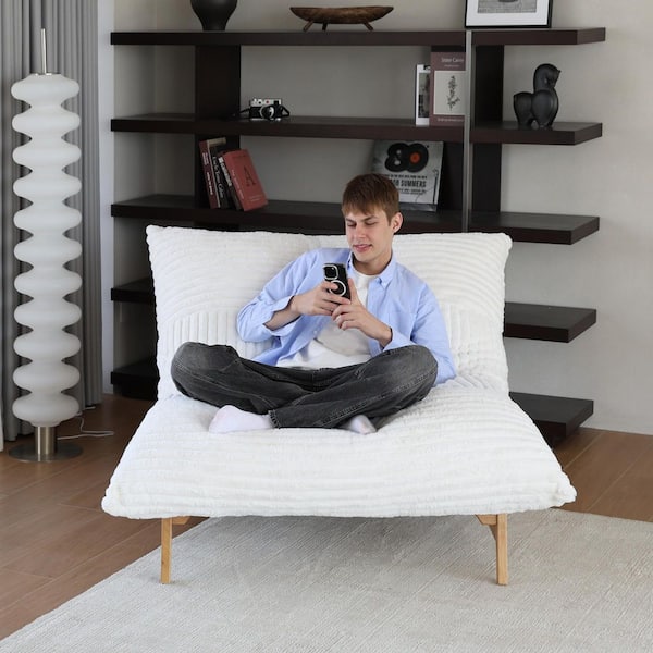 Beige Rabbit Hair Plush Fabric Solid Wood Recliner Chair With Bean Cushion