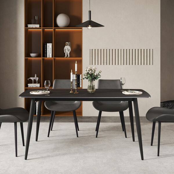 Black Rectangle Sintered Stone Marble 62.99 in. Pedestal Dining Table Seats 6 with Metal Black Legs