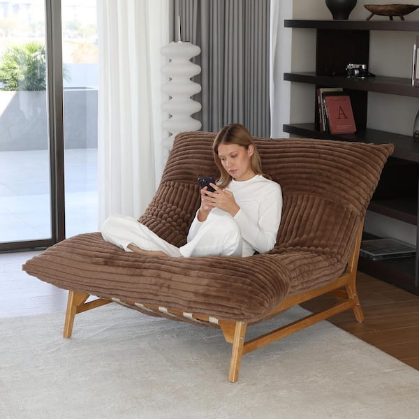 Brown Rabbit Hair Plush Fabric Solid Wood Recliner Chair With Bean Cushion